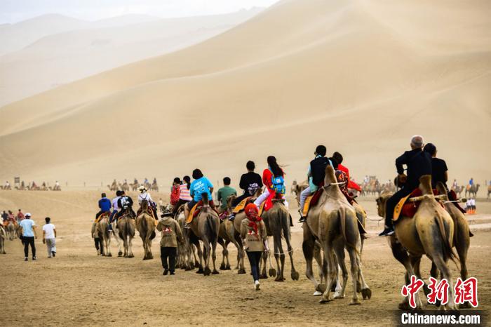 圖為游客騎駱駝暢游鳴沙山?!⊥醣筱y 攝