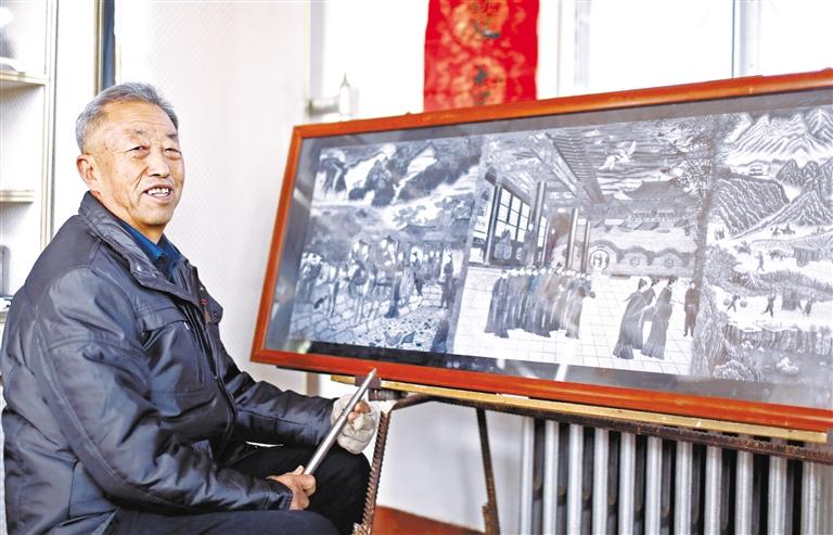 接下來(lái)就是耗費(fèi)工時(shí)與體力的制作過(guò)程,“每天創(chuàng)作雕刻都在三四個(gè)小時(shí),每分鐘在刻板的敲擊次數(shù)達(dá)到近200次,每小時(shí)敲擊次數(shù)達(dá)到8000-12000次,9大板塊在創(chuàng)作過(guò)程中就要敲擊近16億次點(diǎn),每個(gè)板塊耗時(shí)10-11個(gè)月,9大板塊共耗時(shí)3000多天。”陶世清細(xì)數(shù)著創(chuàng)作的艱辛。