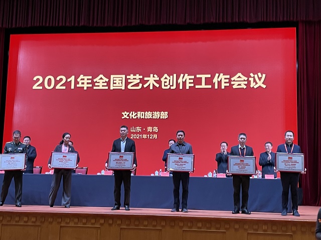 中國甘肅網(wǎng)12月19日訊 12月18日,文化和旅游部在山東省青島市召開的“2021年全國藝術創(chuàng)作工作會議”上,發(fā)布了“慶祝中國共產(chǎn)黨成立100周年舞臺藝術精品創(chuàng)作工程”入選名單,頒發(fā)了“慶祝中國共產(chǎn)黨成立100周年舞臺藝術精品創(chuàng)作工程獎牌”。甘肅省文化和旅游廳遴選推薦的舞劇《絲路花雨》《大夢敦煌》《彩虹之路》、隴劇《官鵝情歌》、小品《你笑起來真好看》等5部舞臺藝術精品,經(jīng)文旅部評審正式入選“舞臺藝術精品創(chuàng)作工程重點扶持作品”。甘肅省歌舞劇院創(chuàng)排的舞劇《絲路花雨》作為12家“百年百部”工程受獎單位在全國藝術創(chuàng)作工作會議上接受獎牌和榮譽證書,甘肅省文旅廳、山東省文旅廳等參會代表12家領獎單位上臺領獎,充分展現(xiàn)了文旅部對甘肅省入選作品質(zhì)量及組織工作的高度肯定。