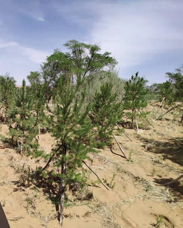 我和同伴撲進沙海柔軟的懷抱。認(rèn)識到,再小的沙粒,也不能與塵世隔絕,我與沙,結(jié)緣于此。沙海里,一沙一世界。黃沙大膽赤裸地暴露在天幕蒼芎下,以大,以小,涵納無窮。“沙沙”的足音里,印下我深深淺淺兩行腳印,宣告著浪漫與踏實的存在。我來到習(xí)近平總書記親手栽植的“五棵松”下,仰視青松,綠云葳蕤,生機勃勃。總書記的關(guān)懷和鼓勵,黃沙熱熱地、輕輕地長出了更多綠色羽翼,這羽翼在不斷地生長壯大,有“代代相傳”的精神,綠色終究會覆蓋全部騰格里。捧起一捧黃沙,細(xì)沙像嬰兒肌膚般的柔滑,我試圖用臉貼近它,這些黃色的小精靈,從我指縫間輕盈地流淌到松下,似乎在暗示我,要把自己的夢筑進治沙精神的瀚海里??茖W(xué)家們已作出結(jié)論:沙漠是人類最后的寶地,別看它現(xiàn)在荒蕪,它里面蘊藏著無盡的寶藏和財富。