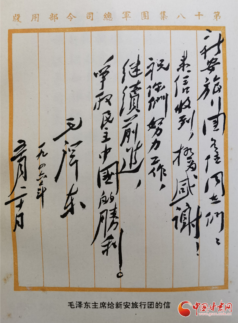 1946年5月20日,毛澤東主席給新旅回信:“新安旅行團(tuán)各位同志們:來信收到,極為感謝!祝你們努力工作,繼續(xù)前進(jìn),爭取民主中國的勝利。”時隔75年后的2021年5月30日,習(xí)近平總書記給新安小學(xué)的少先隊員們回信:“當(dāng)年,在黨的關(guān)懷和領(lǐng)導(dǎo)下,‘新安旅行團(tuán)’不怕艱苦,足跡遍及大半個中國,以文藝為武器,喚起民眾抗日救亡,宣傳黨的主張,展現(xiàn)了愛國奮進(jìn)的精神風(fēng)貌。希望你們結(jié)合自身成長實(shí)際學(xué)好黨史,以英雄模范人物為榜樣,從小堅定聽黨話、跟黨走的決心,刻苦學(xué)習(xí),樹立理想,砥礪品格,增長本領(lǐng),努力實(shí)現(xiàn)德智體美勞全面發(fā)展。”