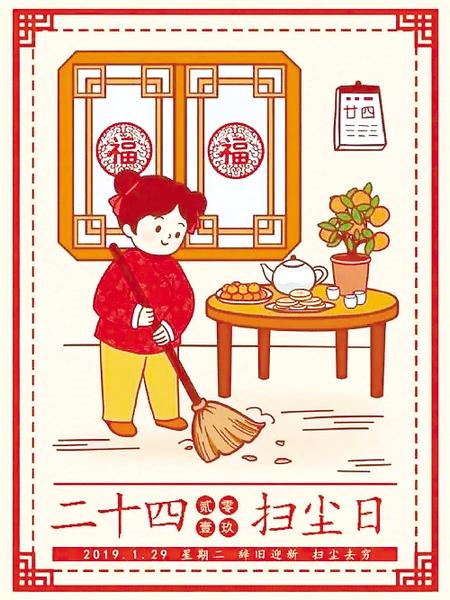 據(jù)《呂氏春秋》記載,這一風(fēng)俗源于堯舜時(shí)代。臘月二十四那天,隴上人家就陸續(xù)開始打掃起來,全家老少一起動(dòng)手,清掃房屋積塵,石灰刷墻,新紙裱糊仰塵,擦洗窗欞,糊上新窗紙,貼窗花或貼“窗孔子”(微型花鳥畫與書法),擦拭箱柜上的銅什件、器皿污垢,打氈抖土,拆洗被褥。一番流汗勞碌,居室煥然一新,過年的心情也更加舒暢。