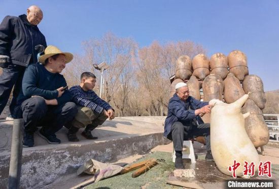 2月24日,春日暖陽(yáng)下,今年70多歲的省級(jí)羊皮筏子非遺傳承人張德寶在蘭州黃河邊制作羊皮筏子,為迎接旅游旺季到來(lái)提前做好準(zhǔn)備。劉玉桃 攝