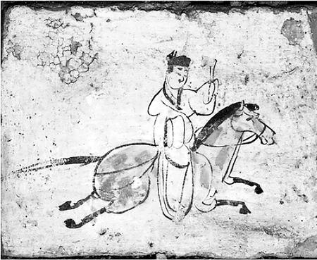 這一時期,自天子以至百官士庶,除乘車外還普遍騎馬。西晉時北方出現(xiàn)上馬時所踩的單馬鐙,南北朝后期又出現(xiàn)嚴格意義上的雙馬鐙。馬鐙的使用能減輕人們騎馬的體力消耗,有利于控制馬匹。這一時代的低級官員和百姓出行還乘驢、騾,甘肅等西北地區(qū)少數(shù)民族多乘駝,運載貨物主要用牛車。漢地民眾出行,仍然是安步當車。嘉峪關(guān)魏晉墓五號墓的《驛使圖》,畫面中一個郵驛使騎在馬上,頭戴進賢冠,身穿右襟寬袖衣,足蹬長靴,左手舉木牘文書,右手持馬韁,驛騎四蹄騰空,飛奔直前。這幅畫再現(xiàn)了當時甘肅地區(qū)驛使馳送文書的情景,也是我國古代郵驛使較早的形象資料。