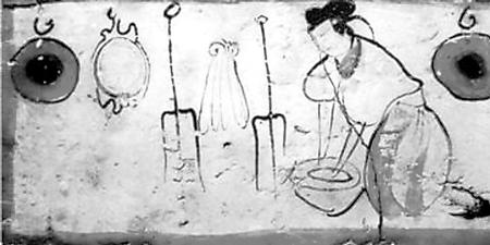 糧食、蔬菜品種與前代相比沒有大的變化,仍是漢地人的主要經(jīng)濟和衣食來源。烹飪方法,這一時期出現(xiàn)了面粉發(fā)酵技術(shù)。北魏賈思勰介紹發(fā)面技術(shù)說:“面一石,白米七八升作粥,以白酒六七升酵中,著火上,酒魚眼沸,絞去滓,以和面,面起可作”(《齊民要術(shù)》卷9)。把北魏時期的容量數(shù)換算成今天的市斤,上段話的意思就是,用五十多斤面粉,五六斤白米做粥,再用四五斤白酒(甜米酒)做酵母,將酒架火上燒至發(fā)出魚眼樣的小泡后,濾去酒渣,加入面粥中發(fā)酵,等面發(fā)起后就可以做餅了。這是一項歷史性的烹飪技術(shù)。從發(fā)面的數(shù)量看,一次發(fā)這樣多面的家庭,至少有三五十口人,顯然是當時世家大族的人口規(guī)模。世族如此,普通民眾也應很快就學習掌握了發(fā)面技術(shù)。