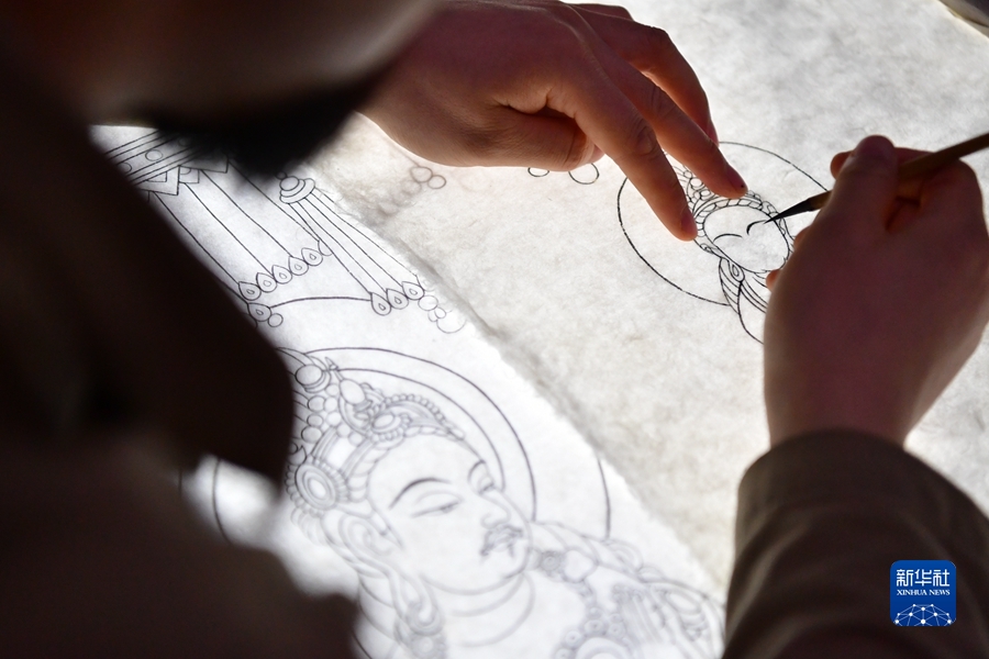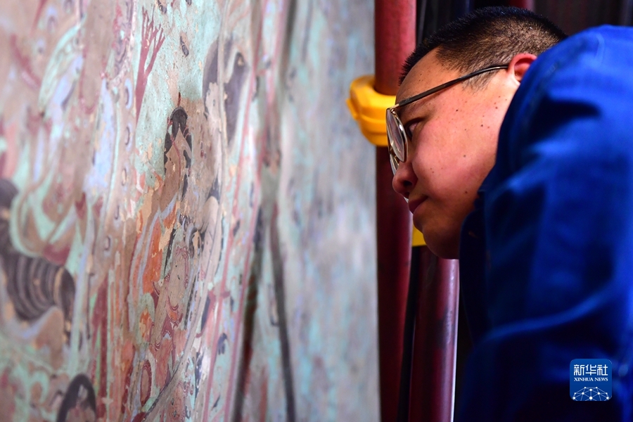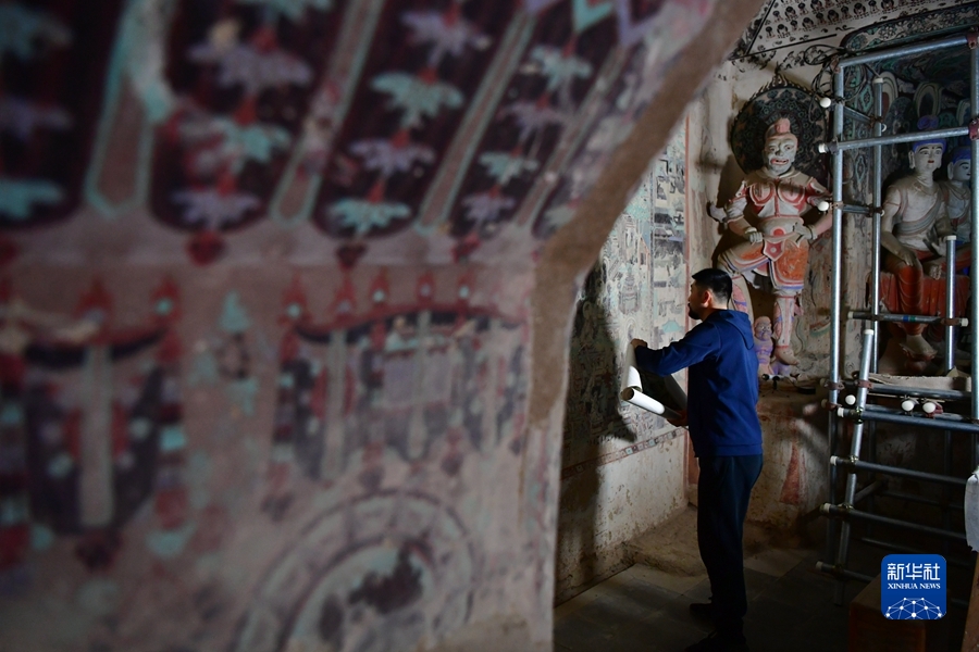 4月19日,在莫高窟第172窟,劉小同在對(duì)比臨摹壁畫的細(xì)節(jié)。新華社記者 杜哲宇 攝