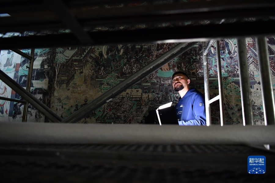 楊金禮今年35歲,他2006年就來(lái)到莫高窟,從學(xué)徒做起,逐漸成長(zhǎng)為敦煌研究院文物保護(hù)技術(shù)服務(wù)中心的一名壁畫修復(fù)工作者。楊金禮每天都會(huì)和同事來(lái)到洞窟內(nèi)“面壁修復(fù)”,通過(guò)專業(yè)技術(shù)手段解決壁畫產(chǎn)生的起甲、空鼓、酥堿等病害,幫助壁畫對(duì)抗時(shí)間的流逝。