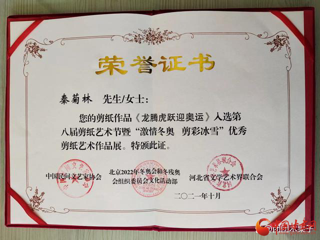 2021年11月由中國民間文藝家協(xié)會、河北省文學藝術(shù)界聯(lián)合會主辦,河北省民間文藝家協(xié)會、中共蔚縣人民政府承辦的“第八屆剪紙藝術(shù)節(jié)暨激情冬奧.剪彩冰雪”優(yōu)秀剪紙藝術(shù)大賽中,剪紙作品《龍騰虎躍迎奧運》榮獲優(yōu)秀收藏作品同時被河北省蔚縣博物館永久收藏,并頒發(fā)收藏證書。
