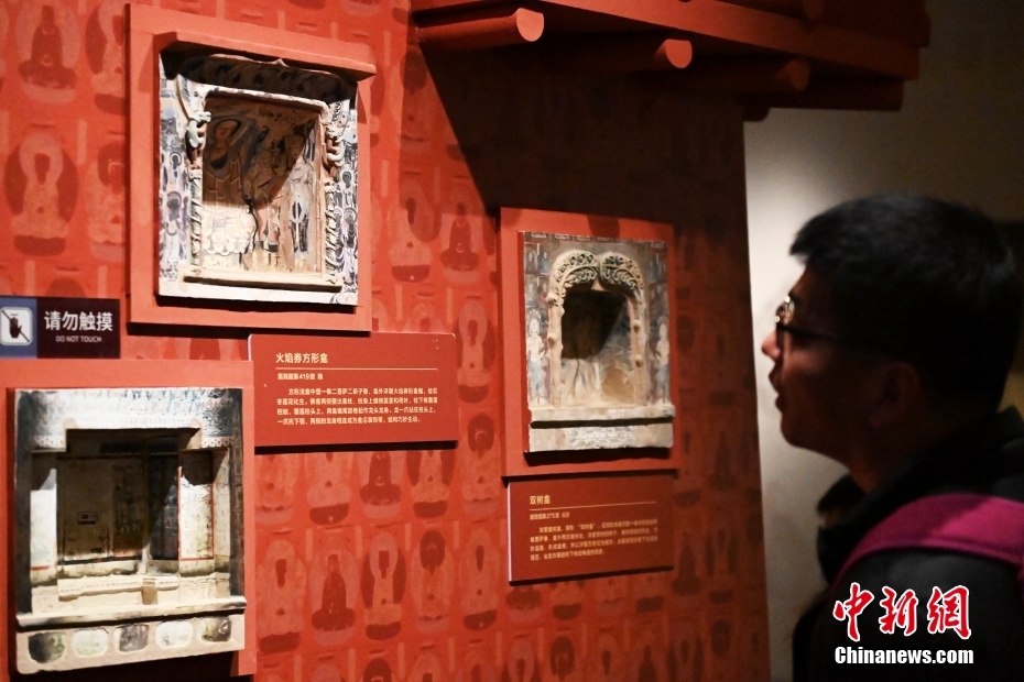 游客正在參觀“千年營造——敦煌壁畫中的建筑之美”特展上出自莫高窟第419窟的火焰券方形龕模型。(中新社記者 李亞龍 攝)
