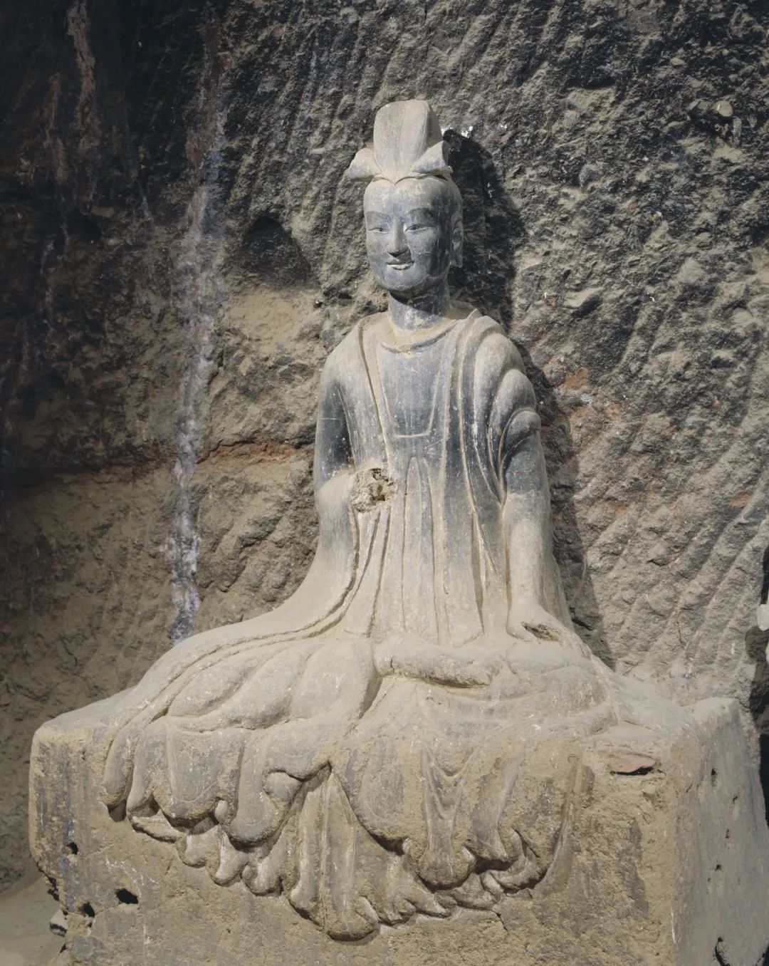 特別是佛像發(fā)髻和衣裾方面的變化尤為突出:樣式豐富的渦旋紋、水波紋和螺紋發(fā)髻交相輝映,八字形重疊衣裾和三片式衣裾并存,生動再現了當時南朝與中原地區(qū)不同佛教造像藝術樣式的交流與融合。
