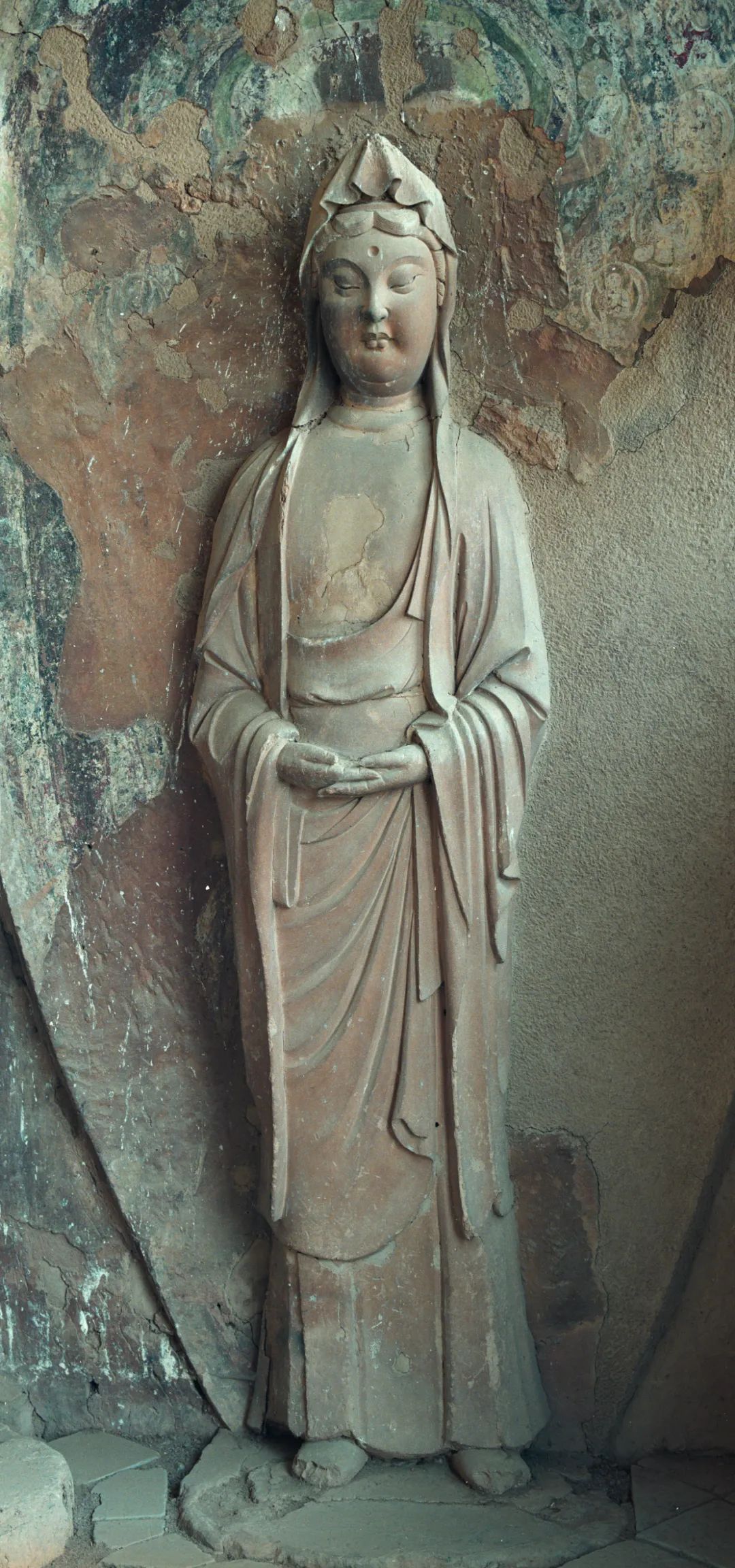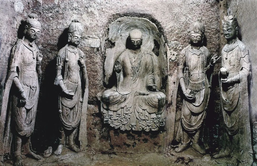 它一改西魏造像繁縟華麗、服飾厚重的特點,無論是佛、菩薩、弟子,還是飛天和力士,服飾輕柔而貼體,均展現出一種雄健挺拔、恬靜自然的氣韻,面相方圓,五官清秀而緊湊。佛低平肉髻,身穿圓領通肩或垂領式袈裟,衣裾下擺緊貼佛座,陰刻圓潤流暢的褶皺紋。菩薩也由束發(fā)高髻改為頭戴花冠,周身飾瓔珞,體姿婀娜而不失端莊。