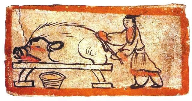 墓磚壁畫(huà)描述古人宰豬場(chǎng)景。