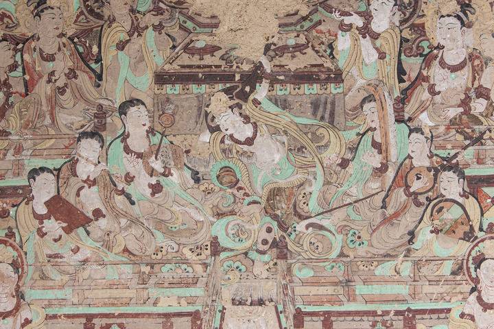 莫高窟第112窟-壁畫-主室北壁-報恩經(jīng)變之樂舞圖。(敦煌研究院供圖)
