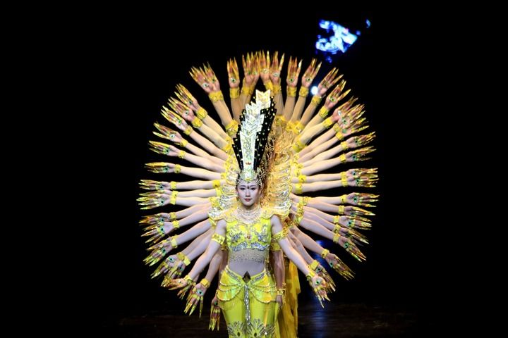2023年9月10日晚,在甘肅敦煌大劇院,演員在大型情景音畫劇《千手千眼》中表演。新華社發(fā)(張曉亮 攝)