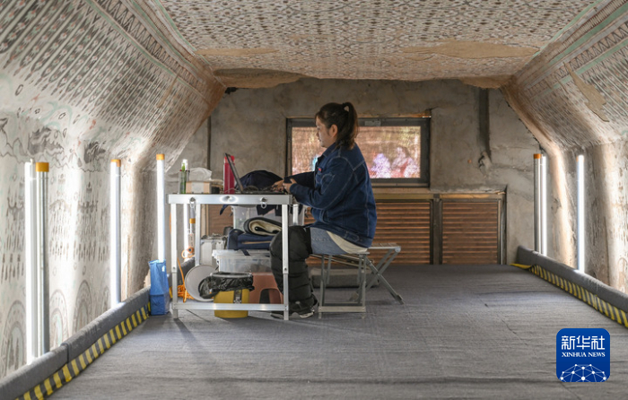 在敦煌莫高窟正在保護修繕的第55窟內(nèi),一位文保工作者對采集的數(shù)據(jù)進行整理(2023年8月3日攝)。新華社記者 李賀 攝