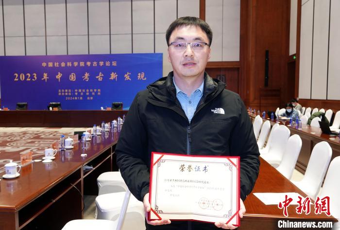 1月30日,2023年中國考古新發(fā)現(xiàn)在北京揭曉發(fā)布,肯尼亞共和國博高利亞湖舊石器時(shí)代遺址入選中國2023年國外考古新發(fā)現(xiàn),趙清坡代表項(xiàng)目領(lǐng)取榮譽(yù)證書在會(huì)場(chǎng)留影。中新網(wǎng)記者 孫自法 攝