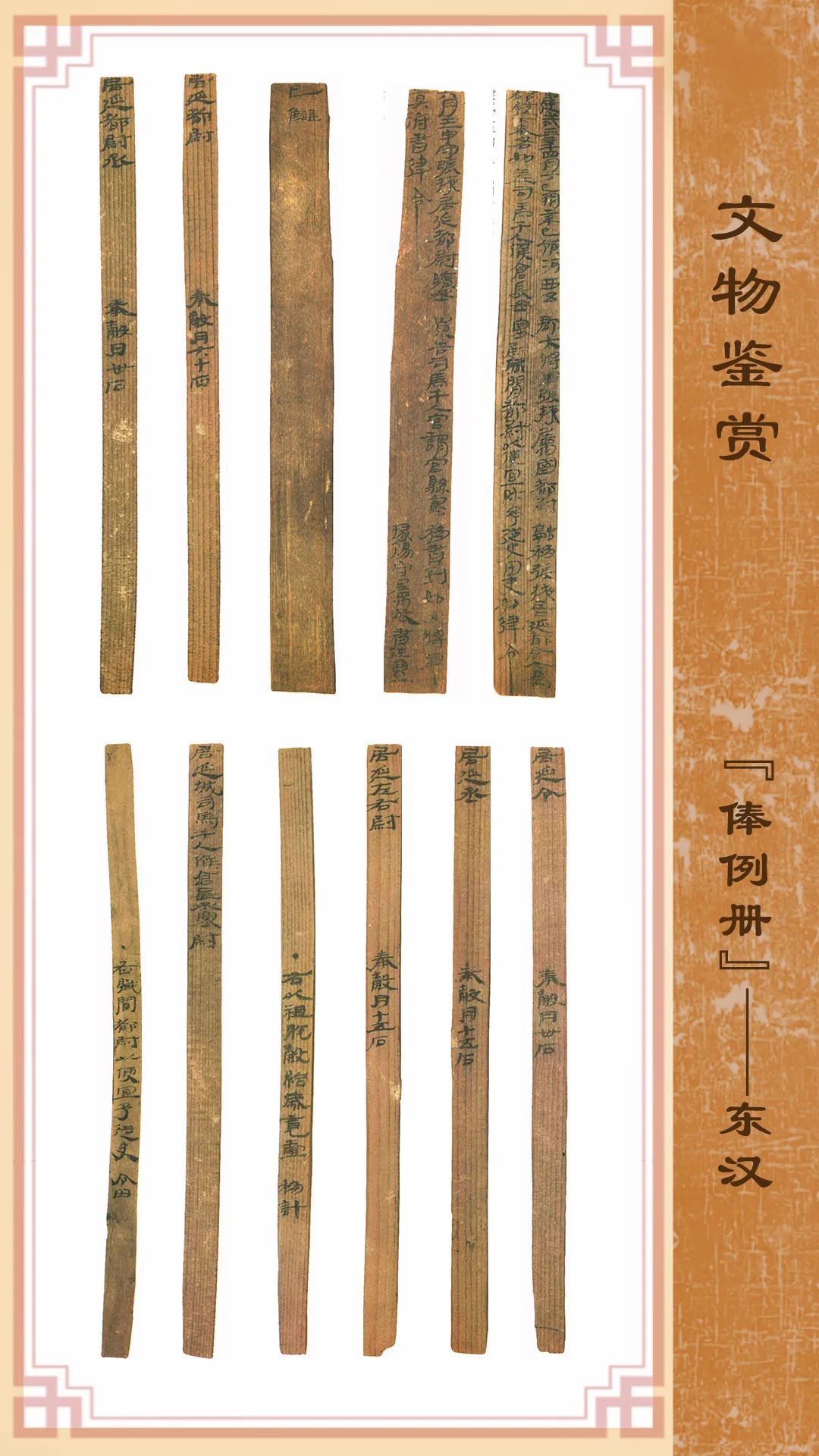 1974年8月出土于甲渠候官遺址第22號房址內(nèi)。簡冊由10枚簡組成,每簡長22.8厘米,前兩簡寬2.5厘米,其余8簡寬1.4厘米。全文200字。內(nèi)容為東漢建武三年(公元25年)竇融統(tǒng)治河西期間留下的一份完整的財政文書。簡文是關(guān)于居延都尉府吏員奉谷標準的通知,由領(lǐng)河西五郡大將軍張掖屬國都尉竇融幕府下發(fā),簡言“如律令”可知其指令具有法律效力。