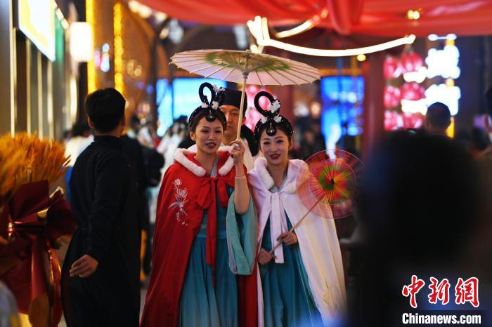 3月22日晚,甘肅省蘭州市黃河食渡文旅美食街內,街區(qū)人員著傳統(tǒng)服飾游園。李亞龍 攝