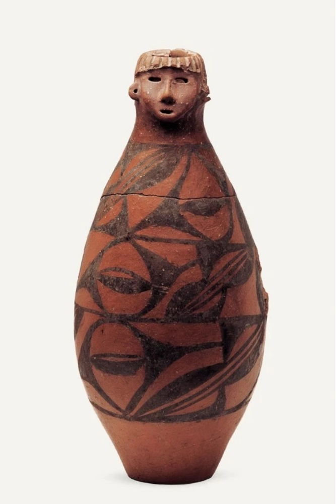 隴東少女作為甘肅的“顯眼包”之一,是曾在《國家寶藏》中出現(xiàn)過的“網(wǎng)紅”、甘肅省博物館鎮(zhèn)館之寶,它于1973年從秦安縣大地灣遺址出土。具有高度審美能力的“托尼”老師,設(shè)計了齊劉海發(fā)型,顯得很泰酷辣,圓鼓腹、平底,人們細(xì)看發(fā)現(xiàn),陶人的兩眼為圓孔洞,顯得目光深邃;鼻子呈蒜頭形,雕有鼻孔;嘴較小,微微張開,好像正在言語;兩耳外展,皆有穿孔;瓶體從上至下以黑彩飾三層大小相同、由弧線三角紋和斜線組成的二方連續(xù)圖案,以示華麗的衣物。另外,陶瓶人頭像的器口運用了不同的制作手法,頭發(fā)、嘴系雕刻而成,鼻、臉是捏塑而成。人頭像五官整齊、面龐秀麗,器身造型典雅,與人物形象渾然一體,既是大地灣文化彩陶的代表作,也是中國史前集彩繪、雕塑與造型藝術(shù)于一身的杰作。估計任誰看一眼,都會被“她”的神秘和美麗所吸引吧。