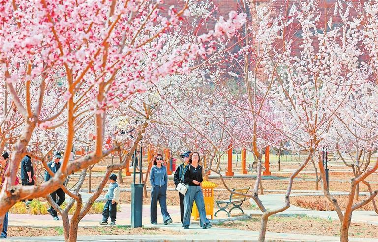 游客在“隴上杏花第一村”東鄉(xiāng)縣唐汪鎮(zhèn)河沿村賞花觀景。 新甘肅·甘肅日?qǐng)?bào)記者 田蹊