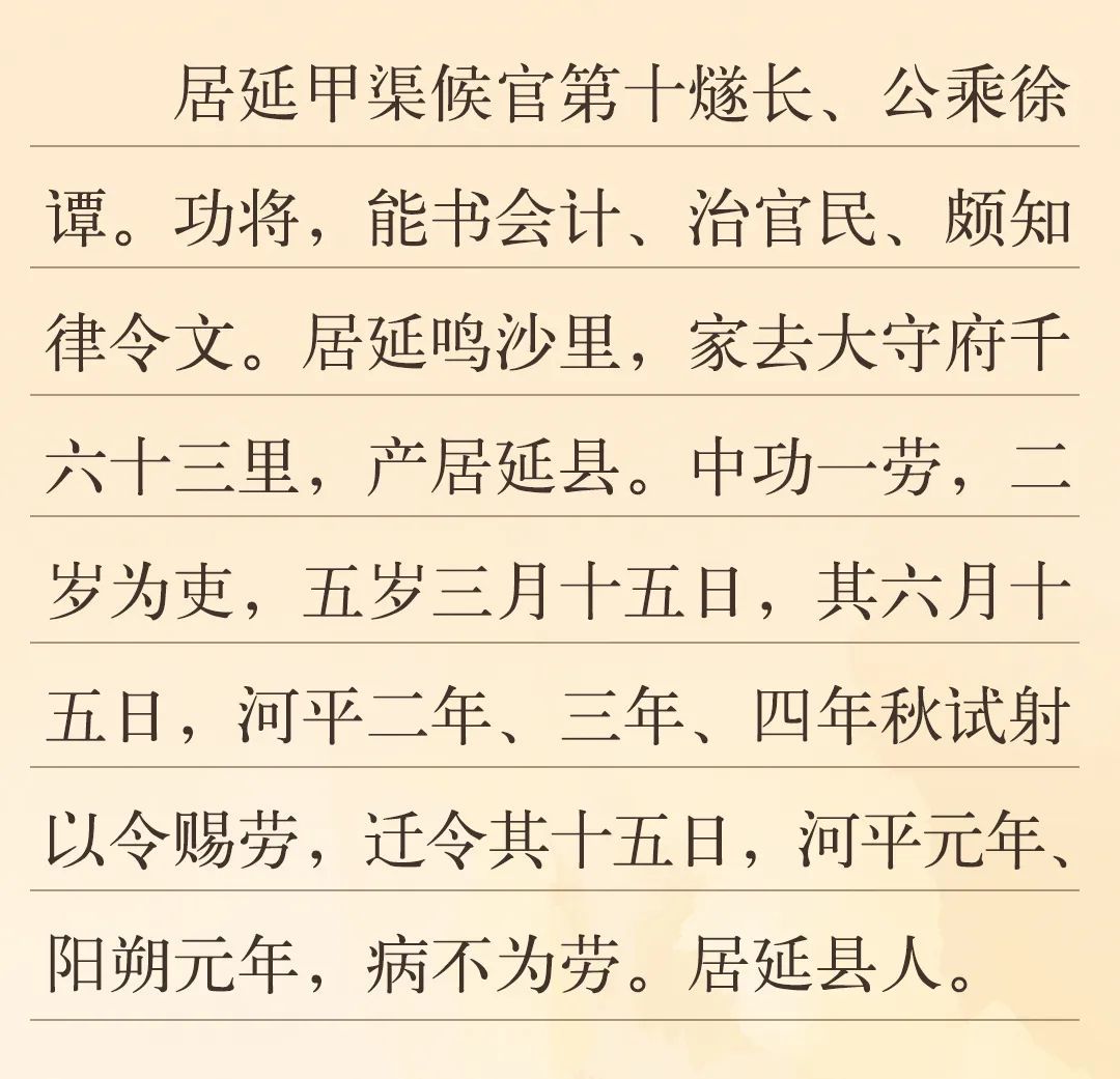 “中功一勞”中的“中功”指得到的功。功、勞、功勞、功績,是漢代計算政績的名稱與單位,戍卒與官員每日巡視、抵御外敵、參與秋射等,都能積攢“功”、“勞”。簡文中提到了“河平二年、三年、四年秋試射以令賜勞”,“秋試射”即漢代秋季比武活動之一的秋射。秋射成績優(yōu)秀可以賞賜勞績,漢代邊塞地區(qū)出土的簡牘中有大量以秋射獲勞的記錄,“功”與“勞”積攢到一定程度,便可升遷。當這位官員所屬的候官發(fā)現(xiàn)空缺,便以功勞案為依據,給出官員任免方案,呈報都尉府,以進行官員的升遷調動。