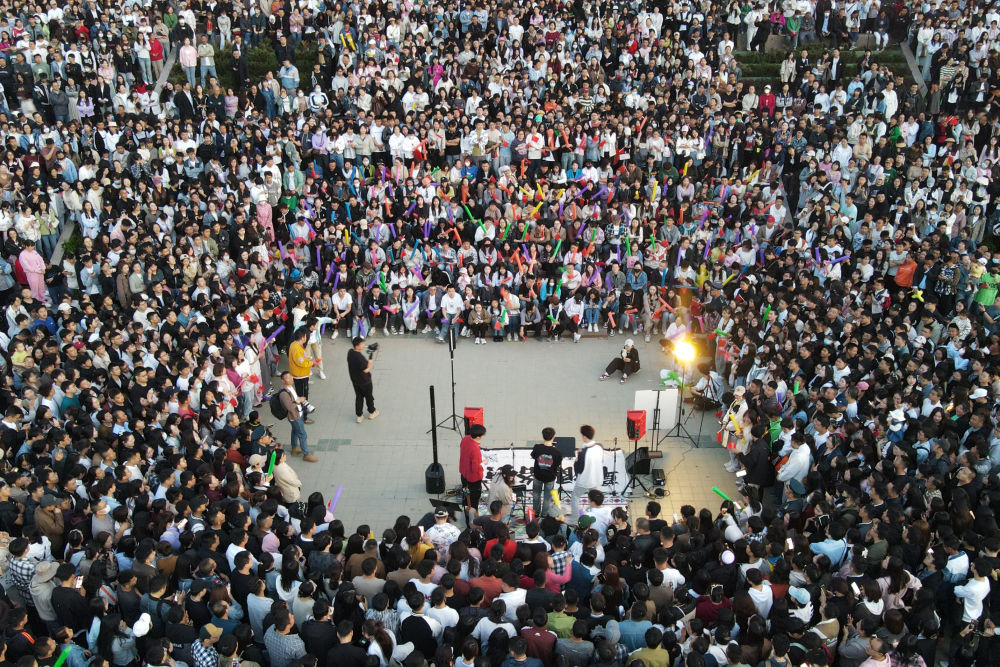 4月26日,游客在蘭州黃河食渡文旅美食街觀看演出。新華社記者 郎兵兵 攝