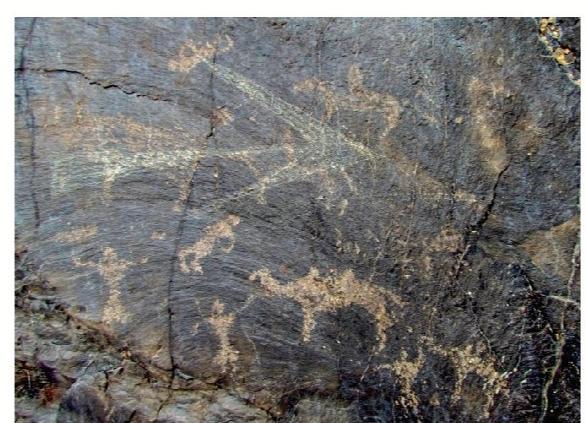 黑山巖畫全稱為“黑山摩崖淺石刻巖畫”,分布于嘉峪關(guān)西北約 10—20公里處的黑山峽谷陡崖峭壁上,為遠(yuǎn)古時(shí)期黑山地區(qū)游牧民族生產(chǎn)、生活的真實(shí)記錄?,F(xiàn)共發(fā)現(xiàn)分布在黑山石關(guān)峽口、磨子溝、蕉蒿溝、四道股形溝、紅柳溝、交河溝六處戰(zhàn)國至明代時(shí)期的巖畫,共 157 幅。黑山巖畫反映的時(shí)限跨度大,時(shí)空關(guān)系復(fù)雜,涉及部族較多。畫面所反映的內(nèi)容豐富多彩,有動(dòng)物、人物、佛塔、植物等,還有大型的操練舞蹈場景。涉及人類學(xué)、社會(huì)學(xué)、歷史學(xué)、考古學(xué)、美術(shù)學(xué)、生物學(xué)、地理學(xué)等多個(gè)學(xué)科,具有較高的研究價(jià)值。