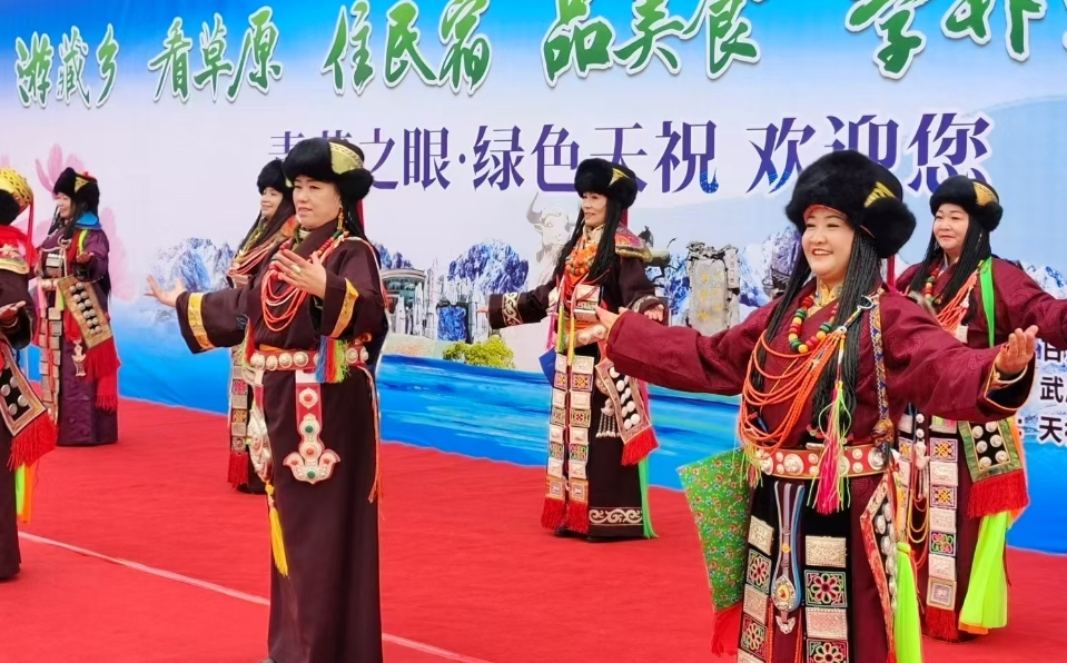 在天祝縣抓喜秀龍阿尼嘎卓帳篷城,身著藏族服飾的美麗卓瑪向采風(fēng)團(tuán)獻(xiàn)上了潔白的哈達(dá),華銳藏歌、華銳則柔、華銳鍋莊等獨具特色的文藝演出讓現(xiàn)場觀眾拍手稱贊。