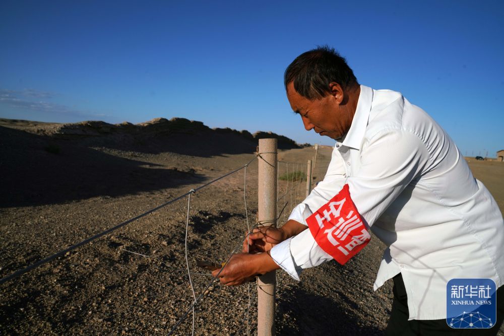 ↑7月16日,張吉全沿著漢長城巡護(hù)時加固防護(hù)欄。