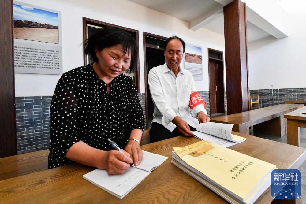 ↑7月16日,張吉全和聞春瑜在漢長城文物保護(hù)管理用房內(nèi)寫巡護(hù)日記。