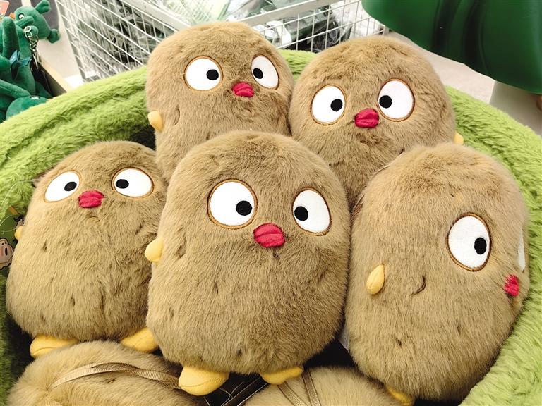 此時(shí),目不暇接的花式文創(chuàng)在店內(nèi)“爭(zhēng)奇斗艷”,爭(zhēng)當(dāng)“顯眼包”,等待被主人帶回家。掀開(kāi)店內(nèi)一只毛絨收納箱,一窩土豆子撲閃著大眼睛向你眨眼。都說(shuō)轉(zhuǎn)角遇到愛(ài),誰(shuí)料,轉(zhuǎn)角處粉嘟嘟的“拿捏玩偶娃娃公仔”捏著一個(gè)小蓮花花苞在向你招手。一回頭,造型別致的文創(chuàng)飾品精美又時(shí)尚,一側(cè)的帆布包上印著“別卷我”。就連記者逛下來(lái),都入手兩件文創(chuàng)。