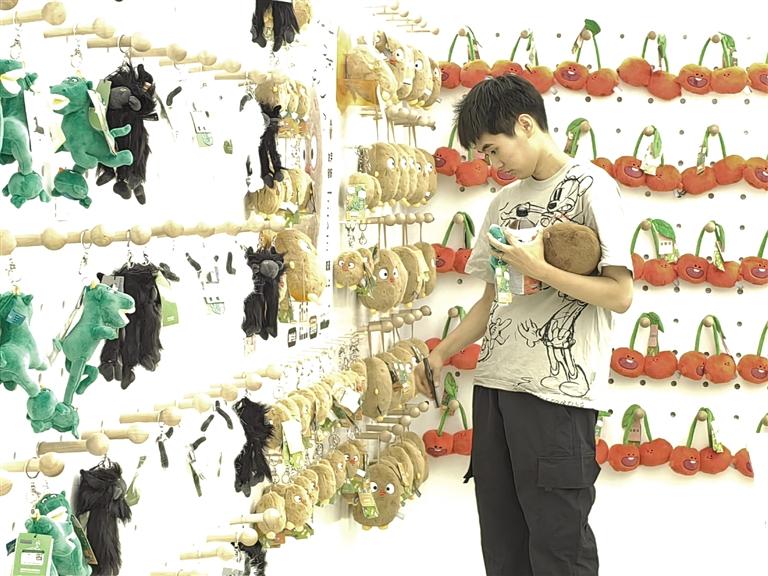 7月17日上午11時(shí),藝術(shù)生活館內(nèi),來(lái)自西安的大學(xué)生小朱入手兩個(gè)綠馬、一個(gè)甘肅麻辣燙毛絨玩具、兩盒禮品包裝三炮臺(tái)。“送家人,送同學(xué),都很好。我感覺(jué)這兒越逛越好玩,不虛此行。”小朱說(shuō)。