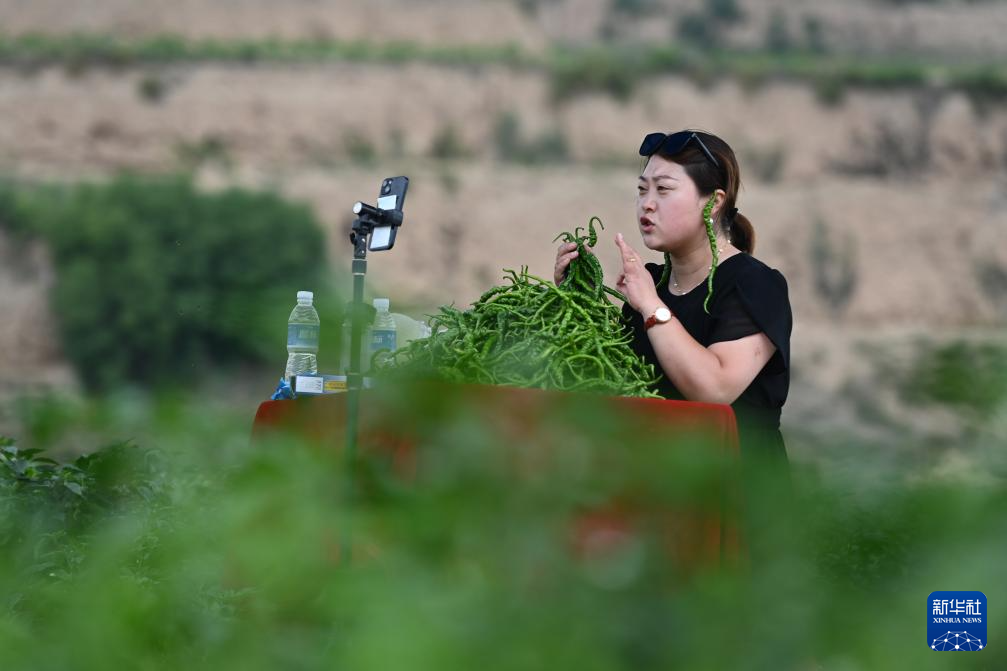 7月22日,在天水市甘谷縣新興鎮(zhèn)侯家溝村的辣椒生產基地,工作人員直播銷售辣椒。新華社記者 范培珅 攝