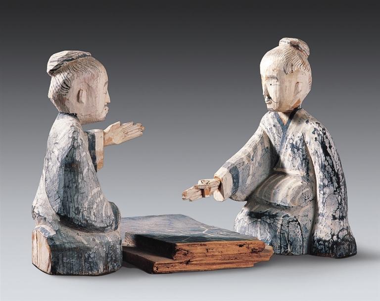 彩繪木六博俑,西漢,武威磨嘴子出土。木俑為兩位跪坐對(duì)局的老者形象,二者間設(shè)一長(zhǎng)方形棋盤(pán)。老者神情凝滯,蓄勢(shì)待發(fā),顯然正在緊張的六博對(duì)局之中??脊虐l(fā)現(xiàn)中不乏漢代博局、棋子、骰子等六博器具,漢墓畫(huà)像磚中也常見(jiàn)相關(guān)圖像,但以雕塑刻畫(huà)六博對(duì)局卻極為罕見(jiàn),這件文物充分體現(xiàn)了漢代木雕藝術(shù)所達(dá)到的高度與境界。