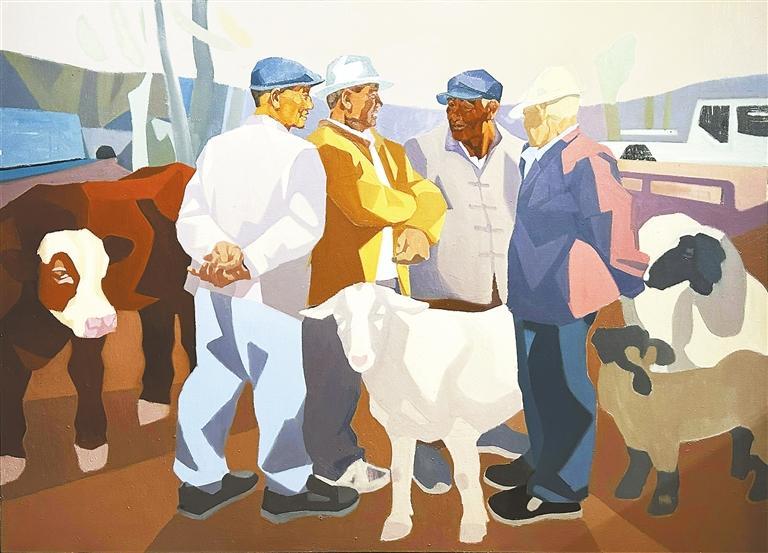 《和風(fēng)》系列作品取材于禮縣鹽官鎮(zhèn)騾馬市場逢集時(shí)交易的場景。幼時(shí),我經(jīng)常隨父親去鹽官騾馬市場趕集,對(duì)這個(gè)場景熟悉且親切。也正因?yàn)槿绱?,我?duì)這個(gè)題材有著難以割舍的情愫,總是忍不住想通過畫筆呈現(xiàn)這一記憶。
