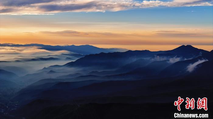 8月14日晚,蘭州市榆中縣馬坡鄉(xiāng),夕陽(yáng)在云海里翻滾,映照大地和村莊城鎮(zhèn),美不勝收。圖為云海日落籠罩黛青色山脈。丁永睿 攝