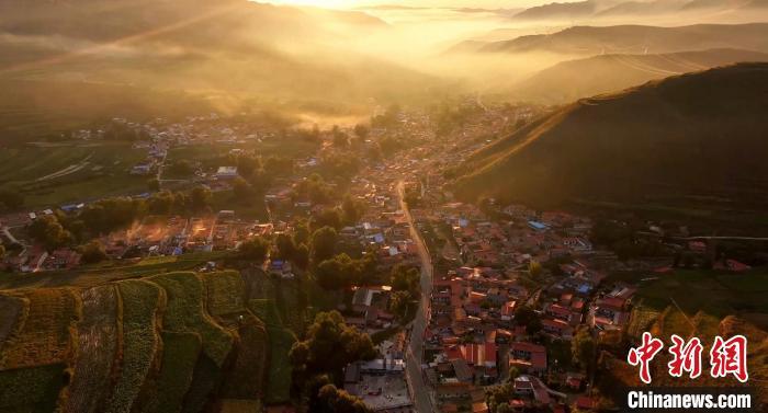8月14日晚,蘭州市榆中縣馬坡鄉(xiāng),夕陽(yáng)在云海里翻滾,映照大地和村莊城鎮(zhèn),美不勝收。圖為琥珀色黃昏。丁永睿 攝