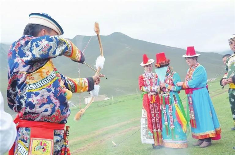 按照裕固族風(fēng)俗,在贈(zèng)羊小腿的同時(shí),要向新娘舉行射無(wú)簇箭的儀式,新郎向新娘連射三支沒(méi)有箭頭的箭,象征新郎新娘相親相愛(ài),白頭到老。射罷,新郎把弓箭折斷,扔到門(mén)旁,由老人投進(jìn)火里燒掉。