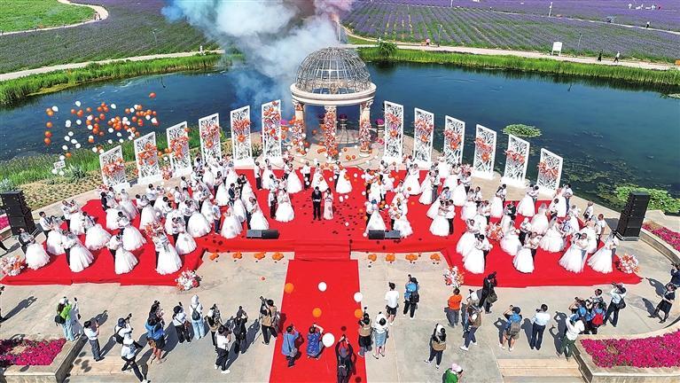 陽光、微風(fēng)、花海……夏季的金昌紫金花海充滿浪漫氣息,溫柔而熱烈。6月29日上午,連續(xù)舉辦七屆的“遇見愛,遇見你”薰衣草集體婚禮如約開場。近年來,一場場薰衣草之約集體婚禮引領(lǐng)金昌婚慶經(jīng)濟進入一個快速發(fā)展階段,集體婚禮也成為金昌旅游對外宣傳推介的一張亮麗名片。
