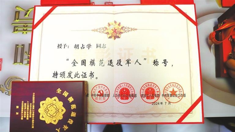 今年8月,胡占學被人力資源和社會保障部、中共中央組織部、退役軍人事務部、中央軍委政治工作部等軍地相關(guān)部門聯(lián)合授予“全國模范退役軍人”榮譽稱號,這是對退役軍人的最高榮譽和最大褒獎。
