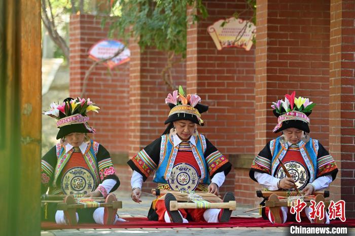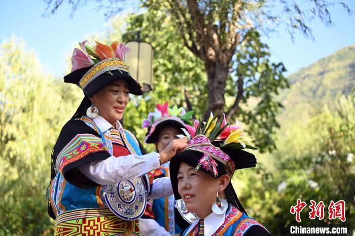 9月26日,甘肅省甘南藏族自治州舟曲縣,當?shù)夭刈鍕D女展示錦帶佩戴方式。錦帶是舟曲藏族婦女用以束腰、扎靴、攏發(fā)乃至點綴服飾的花帶子,艷麗多彩、圖案優(yōu)美。每逢吉慶節(jié)日,藏族婦女穿戴的華麗盛裝就需要少則五、六條,多則十幾條寬窄長短相宜的錦帶來裝飾。據(jù)介紹,藏族織錦帶技藝歷史悠久,一千多年以前,古羌族和吐蕃已有了較發(fā)達的手工編織技術(shù),在艱難的生活條件下對服飾等生活用品除實用功能之外,已經(jīng)有了強烈的審美追求,是研究舟曲羌藏文化的“活化石”。中新社記者 九美旦增 攝