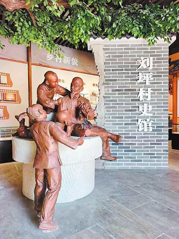 年復(fù)一年的寒來暑往中,大榆樹,也就成了劉坪村的望鄉(xiāng)臺(tái)。每個(gè)村莊,都有它的望鄉(xiāng)臺(tái),它承載著人們共同的記憶,是人們重溫鄉(xiāng)愁的地標(biāo),永遠(yuǎn)鐫刻在人們的心底。2000年,電視劇《黃沙下面是沃土》的劇組來到劉坪村拍攝取景,村里的望鄉(xiāng)臺(tái)大榆樹被拍進(jìn)電視劇畫面。在劉坪村村史館布設(shè)中,專家和學(xué)者數(shù)易村史館方案,最終確定在村史館正門之內(nèi)塑造一組雕塑,意思是由一位老人講述劉坪村的村史,作為村史館的題眼,村史館內(nèi)還陳列了《劉坪村志》,分為建置、地理、村落文化、風(fēng)土人情等14卷,共40萬字。館內(nèi)能播放劉坪村村史專題片《耕讀傳家》。
