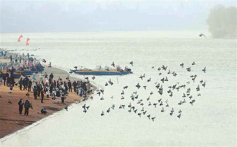 冬日的黃河蘭州段,鴿群飛翔,游人在黃河岸邊盡享愜意時(shí)光。新甘肅·甘肅日?qǐng)?bào)記者 周尚業(yè)