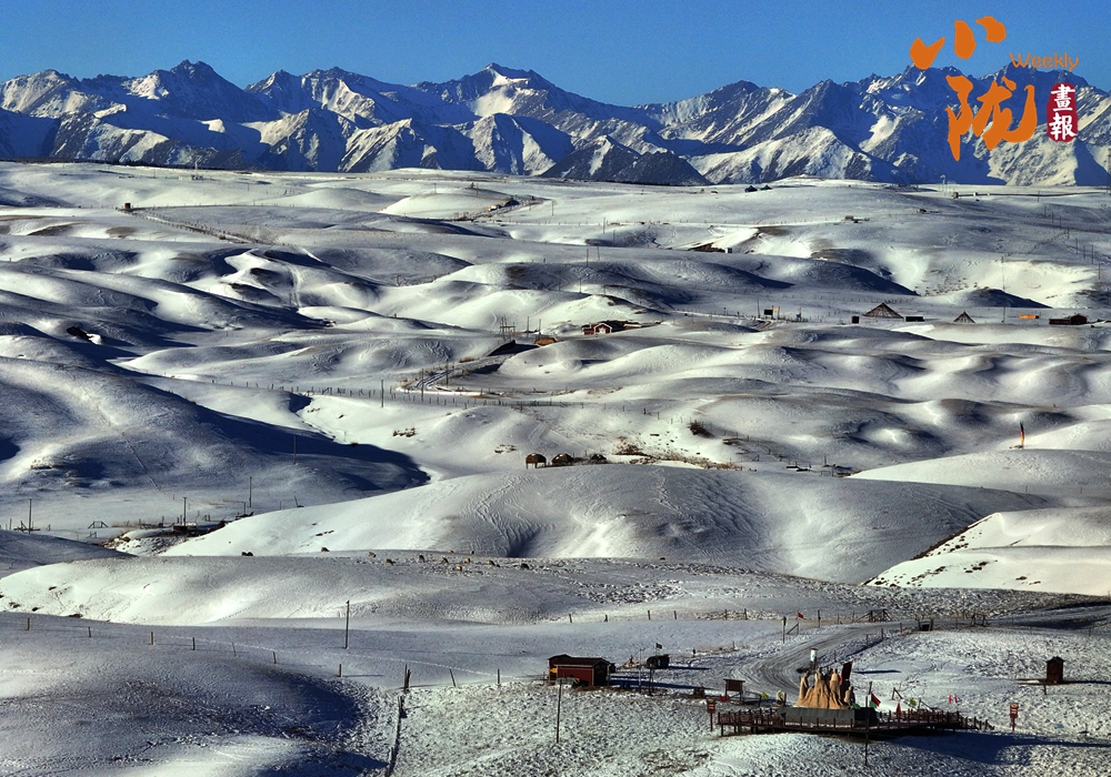藍(lán)天如洗,鋪滿(mǎn)白雪的草原,與群山相映,蒼茫無(wú)際,呈現(xiàn)出安然素美的意境。
