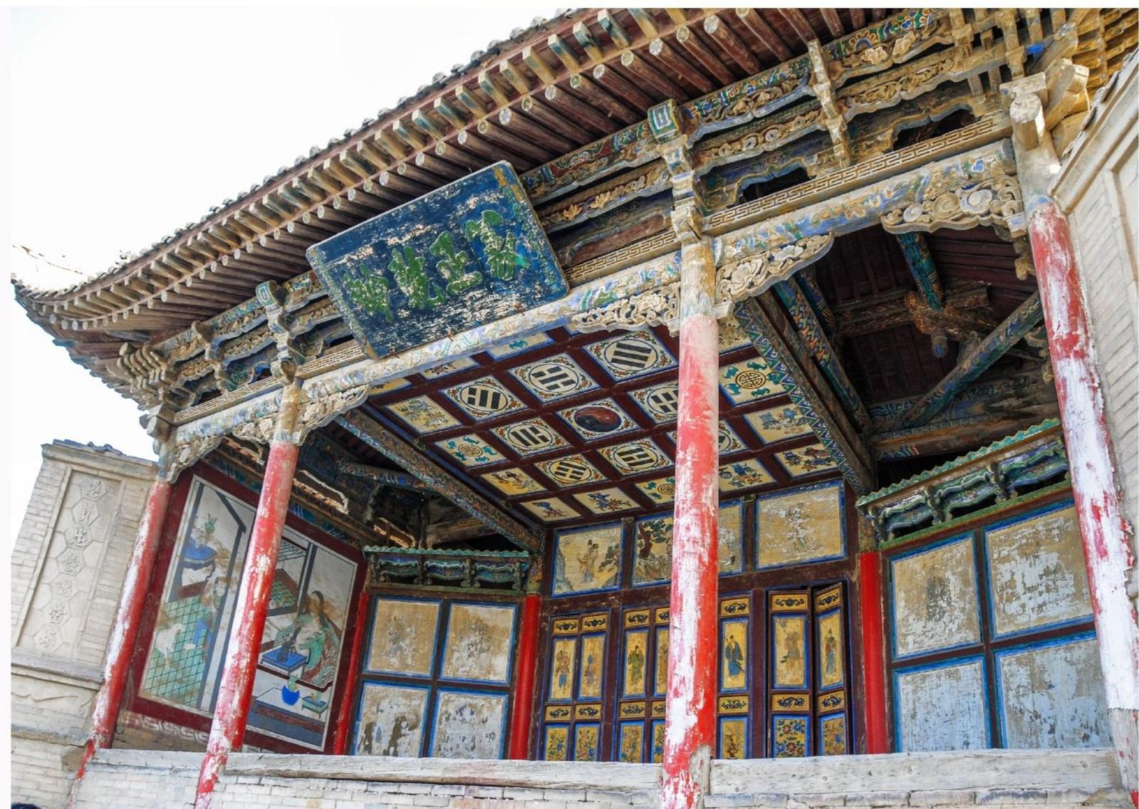 關(guān)帝廟戲樓(現(xiàn)存),關(guān)帝廟又稱武安王廟。明朝中期修建,萬歷六年(公元1578年)奉命鎮(zhèn)守嘉峪關(guān)的酒泉人佘動(dòng)帶頭重修。乾隆五十七年(公元1792年),游擊將軍袋什衣主持重修,關(guān)帝廟戲樓是當(dāng)時(shí)守城官兵、城內(nèi)居民及過往商旅的娛樂場所。戲樓位于朝宗門斜對面,南閘門內(nèi)側(cè),關(guān)帝廟對面。它的形制是典型的中國傳統(tǒng)古典戲臺(tái)。關(guān)帝廟戲臺(tái)上就有一副意義深遠(yuǎn)的對聯(lián),在兩側(cè)的八字屏風(fēng)磚上刻有:“離合悲歡演往事,愚賢忠佞認(rèn)當(dāng)場。”