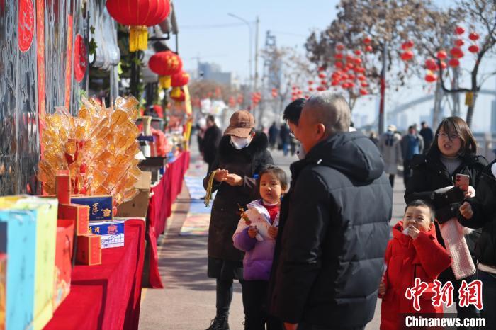 2月8日,甘肅省蘭州市城關(guān)區(qū)“非遺年貨購物月”活動(dòng)現(xiàn)場,游人逛街。中新社記者 李亞龍 攝