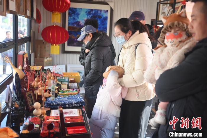2月8日,甘肅省蘭州市城關(guān)區(qū)“非遺年貨購物月”活動(dòng)現(xiàn)場,游人選購非遺文創(chuàng)產(chǎn)品。中新社記者 李亞龍 攝