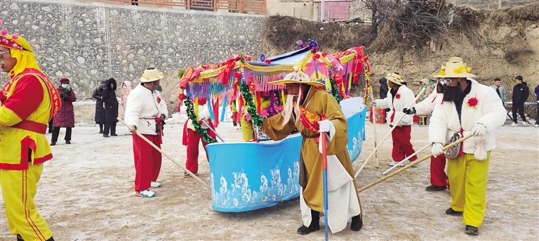 旱般表演時(shí)節(jié)奏由慢漸快,闖激流、過(guò)險(xiǎn)灘,同時(shí),彩扇、華燈秧歌隊(duì)協(xié)同表演,并以《十道河》《迎春歌》等伴唱,用三弦、二胡、笛子等伴奏的隴上民間小調(diào)烘托氣氛。