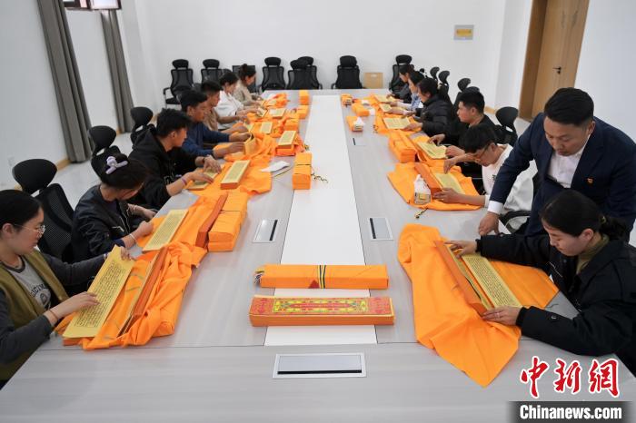 2月27日,在甘肅甘南藏族自治州碌曲縣益西達吉科技有限公司內(nèi),工作人員正在進行藏文古籍數(shù)字化相關工作。該公司主要從事民族古籍數(shù)字化建設和古籍文獻數(shù)據(jù)庫建設,自2019年以來,承擔西藏、四川、甘肅等省區(qū)的藏文古籍數(shù)字化項目。圖為工作人員對藏文古籍(木刻版)做數(shù)字化工作前期準備。中新社記者 九美旦增 攝