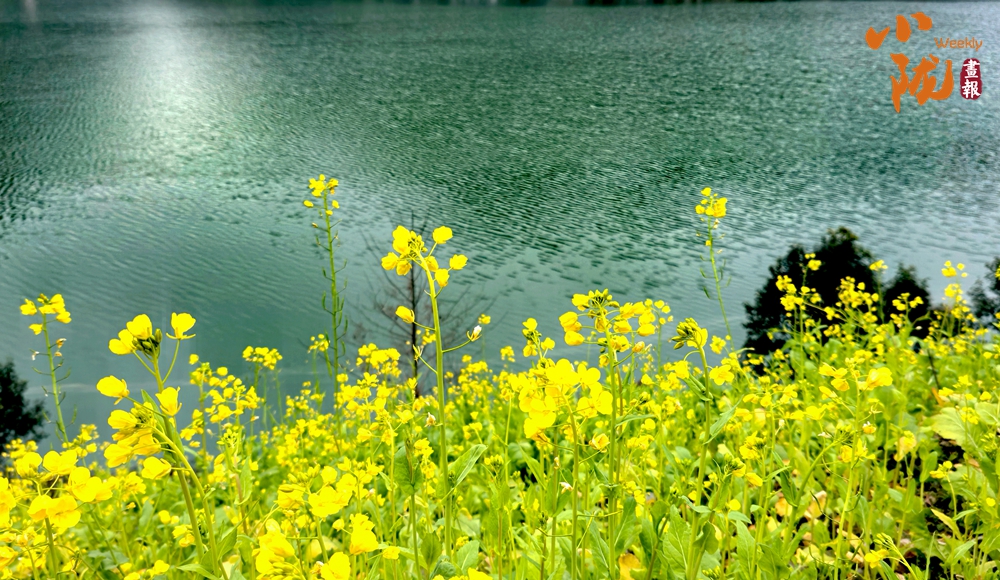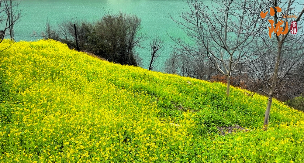 微風輕拂,朵朵油菜花隨風搖曳,與湛藍的河水相互映襯,如詩如畫。